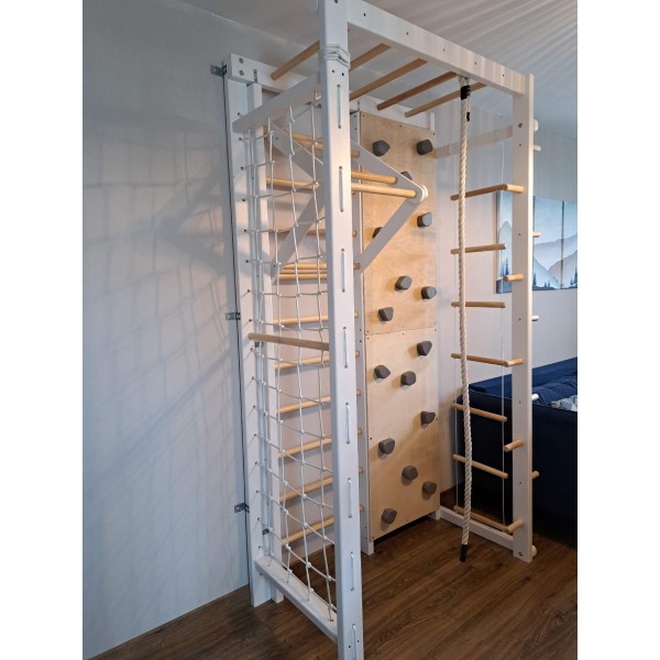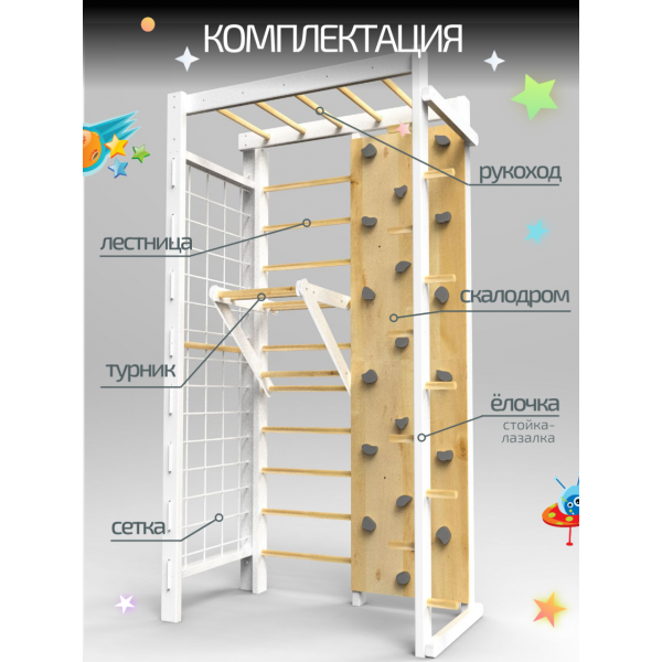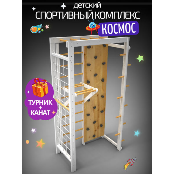 Детский спортивный комплекс «Космос» — это безопасный и прочный спортивный уголок для детей высотой 240 см. В комплекте: шведская лестница, рукоход, скалодром, сетка, турник, канат и верёвочная лестница. Подходит для квартиры, дома или игровой комнаты. Изготавливается в любых цветах и размерах, доставка по всей России.